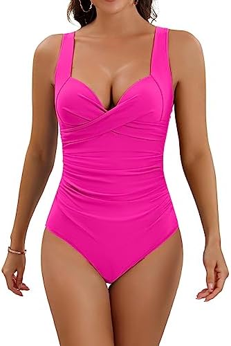 Hilor Women’s One Piece Swimsuits Pin Tucked Surplice Swimwear Tummy Control Bathing Suits Monokinis