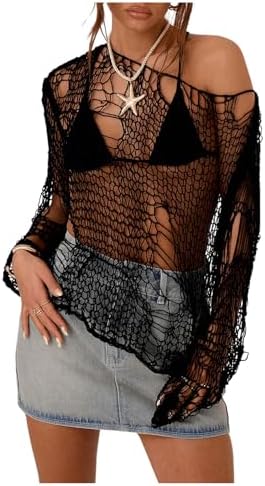 SHENHE Women’s Sheer Hollow Out Off Shoulder Distressed Grunge Punk Sexy Sweater Knit Top Bikini Coverup Top