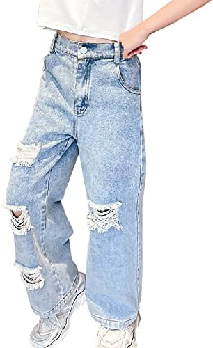 Kids Girls’ Casual Wide Leg Baggy Ripped Jeans Cool Loose Fit Distressed Denim Pants Size 5-14 Years