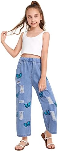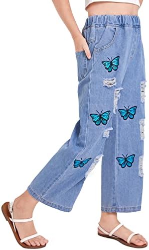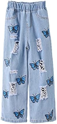 Home Jeans Jeans for Girls WDIRARA Girl’s Butterfly Print Elastic Waist Wide Leg Ripped Jeans Denim Pants