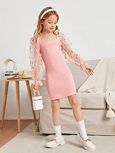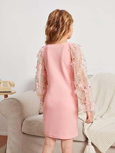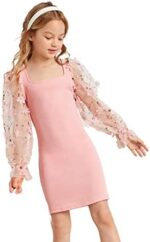 WDIRARA Girl’s Sheer Mesh Flounce Long Sleeve Appliques Square Neck Dress