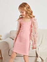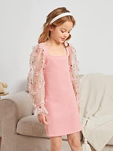WDIRARA Girl’s Sheer Mesh Flounce Long Sleeve Appliques Square Neck Dress